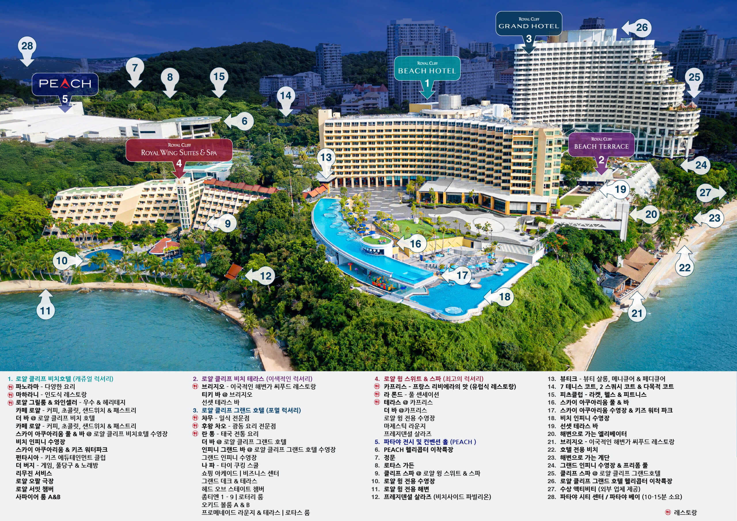 파타야는 방나-트랏 고속도로 또는 방콕-촌부리 고속도로를 따라 방콕에서 차로 90분 거리에 있습니다. Royal Cliff Hotels Group은 파타야 만 남쪽 끝의 위치하고 있습니다.