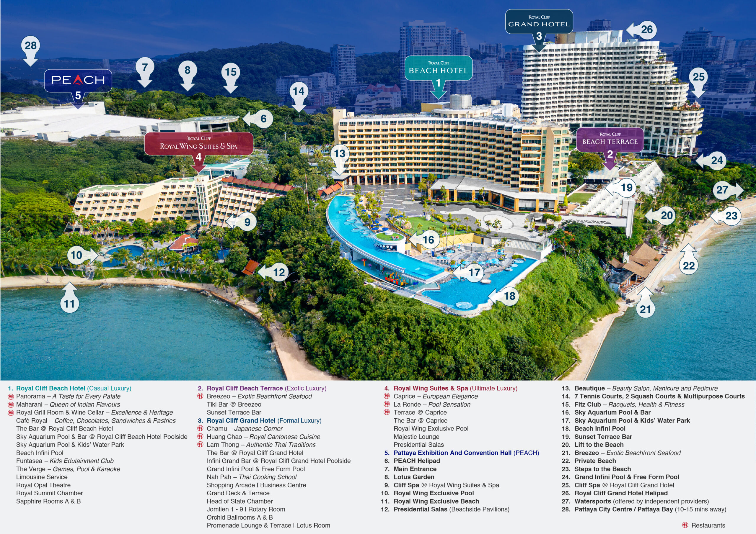 Pattaya is a pleasant 90-minute drive from Bangkok along the Bangna-Trat Highway or Bangkok-Chonburi Motorway. The Royal Cliff Hotels Group is located on the headland at the southern end of Pattaya Bay.