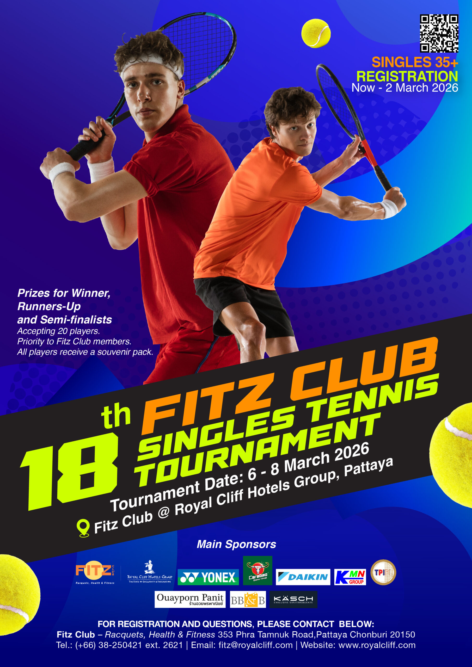 Pattaya, Thailand – The excitement returns as the 18th Fitz Club Singles Tennis Tournament serves up an electrifying weekend of sport from 6 – 8 March 2026 at Fitz Club – Racquets, Health & Fitness Pattaya. Over three action-packed days, the courts will come alive with dynamic rallies, competitive spirit, and outstanding sportsmanship. Widely regarded as one of Pattaya’s premier sporting highlights, this celebrated tournament continues to strengthen its reputation as a cornerstone of the city’s vibrant active-lifestyle scene.