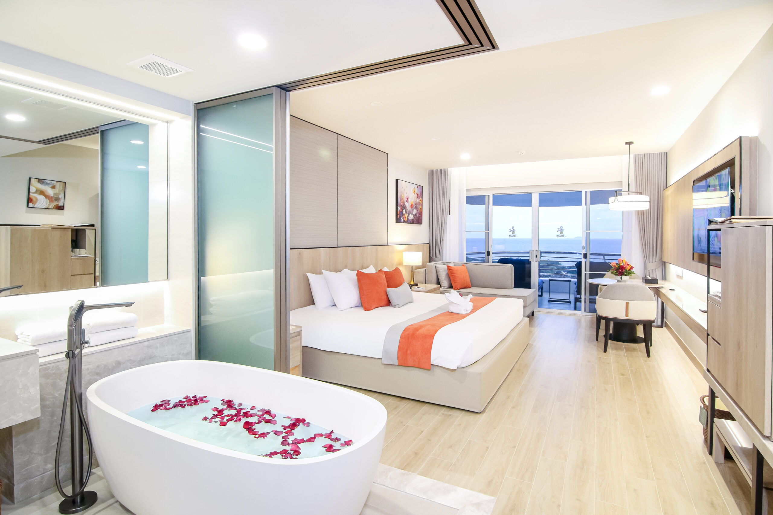 For decades, the Royal Cliff Grand Hotel has been an iconic beachfront destination in Pattaya, cherished by travelers worldwide. Attentive to our valued guests’ feedback, our management team has reimagined and elevated the guest experience with the unveiling of the newly renovated Grand Ocean Pearl room. This tranquil oasis, inspired by the mesmerizing beauty of the ocean and pristine sandy beaches, blends modern amenities with a serene atmosphere. The spacious living area, complete with a long, inviting sofa, opens onto a private balcony offering panoramic 180-degree sea views and gentle coastal breezes.