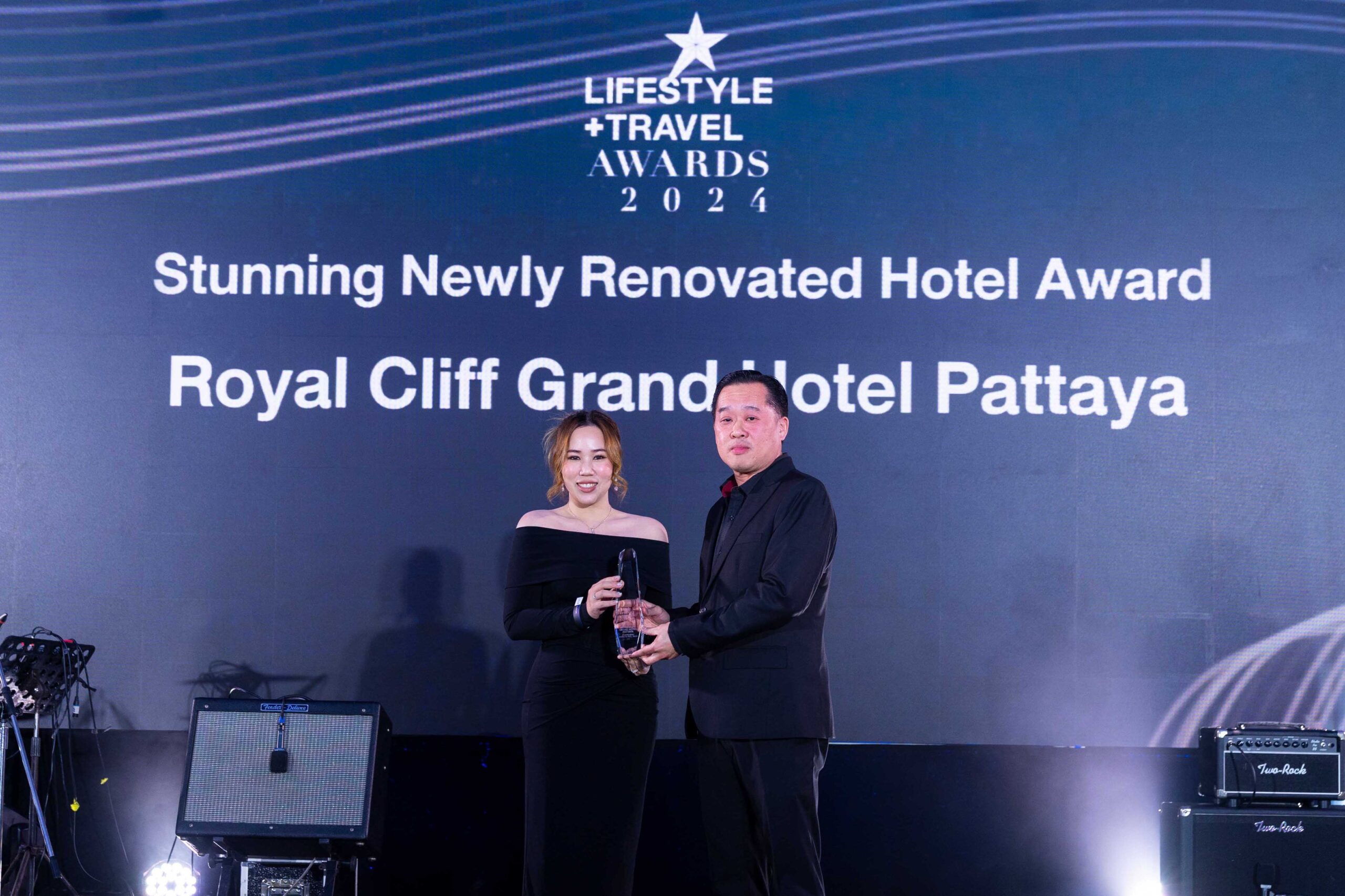 Miss Vankamon Athikomkulchai, Marketing and PR Manager at the Royal Cliff Hotels Group, receives the Lifestyle+Travel Awards 2024 in the category of Stunning Newly Renovated Hotel from Mr. Apiphop Phungchanchaikul, Executive Director of Lifestyle and Travel Media Co., Ltd.