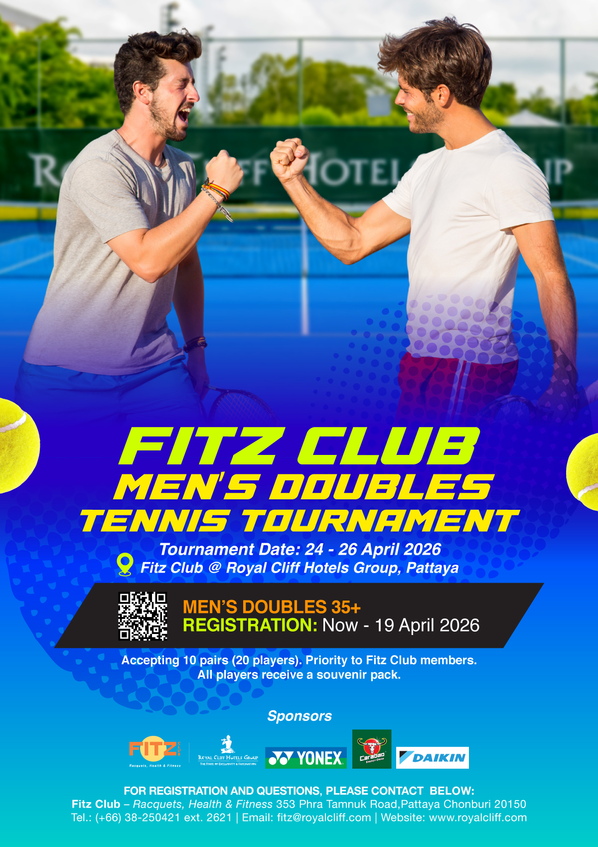 Registration is now open until 19 April 2026. Spectators and tennis lovers are also warmly invited to enjoy the vibrant courtside atmosphere, complete with refreshing food and beverages throughout the tournament weekend. For registration and enquiries, please contact [email protected], call 038 250 421 ext. 2621, or visit https://www.royalcliff.com/fitzclubtennis/